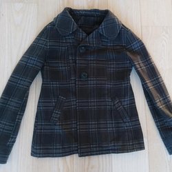 Svart jacka med dragkedja och tryckknappar. Jackan har en huva och flera fickor med dragkedja.