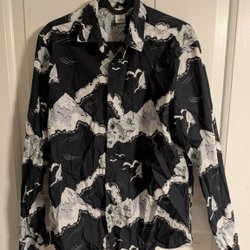 Svart blus med långa ärmar och v-ringning. Blusen har resår nedtill och vid ärmsluten. Den har en liten öppning med knapp i nacken. Tunt genomskinligt tyg. Använd någon enstaka gång så i nyskick.