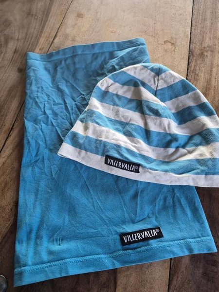 Ett set med en mössa och en tubhalsduk i matchande färger. Mössan har ett randigt mönster i vitt och ljusblått, medan tubhalsduken är enfärgad ljusblå. Båda plaggen har en svart etikett med texten "VILLERVALLA®".