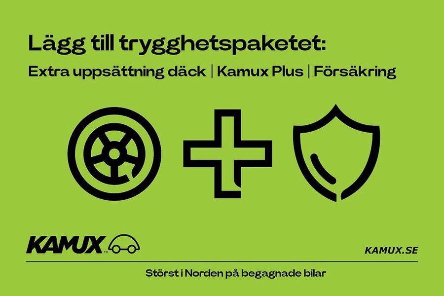 Takreling aluminiumeloxerad Audi pre sense front Helljusassistent Ljuspaket Styled Keyless nyckellöst system Beg Vinterdäck alufälg ingår utan kostnad Sportstolar Takreling aluminiumeloxerad Smidda aluminiumfälgar i 15-ekrad turbindesign delvis polerade storlek 7 5j x 17 med däck 225/45 r17 Ljuspaket Styled Gör en trygg bilaffär! Kamux är en MRF-ansluten bilfirma och vi erbjuder gratis Carfax-rapport på samtliga våra bilar. Vi skräddarsyr din bilaffär och erbjuder en rad olika tjänster för din nya bil: t ex finansiering och försäkring och även däck om det behövs. Dessutom tar vi gärna din nuvarande bil i inbyte. Till många av våra bilar (max 10 år gamla och som gått max 200000 km) kan du för 5000 kr köpa till vårt eget tilläggsskydd Kamux Plus. Kamux är Nordens största begagnathandlare. Besök gärna www.kamux.se för att läsa mer och hitta bilen som passar just dig bäst. Du kan hämta din nya bil på närmaste Kamux-butik eller få den levererad till dörren. Kontakta oss gärna innan du åker iväg för att titta på bilen så att du inte riskerar att bilen blir såld i mellantiden! Har du frågor eller vill du helt enkelt reservera bilen? Du kan nå oss på telefon mån-lör 09:00 - 22:00 och sön 12:00 - 22:00. Chatten är bemannad mån-fre 08:00 - 22:00 och lör - sön 12:00 - 22:00. VÄLKOMMEN TILL OSS PÅ KAMUX!