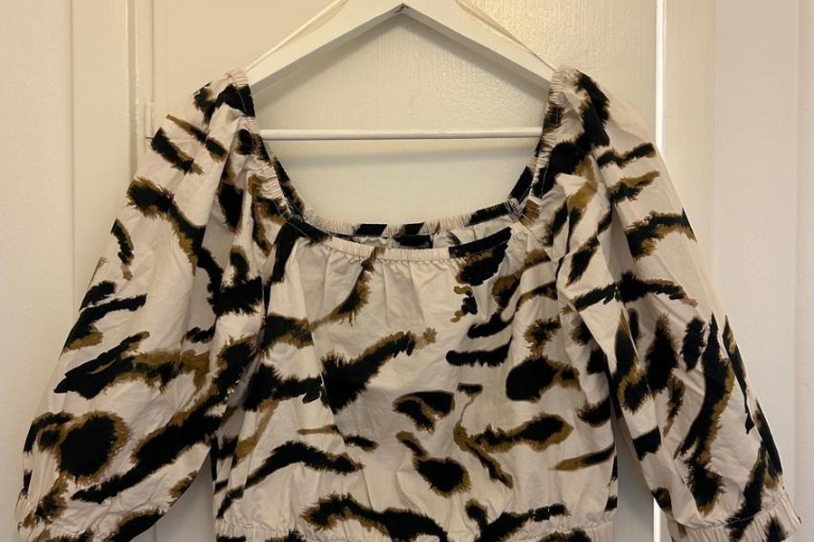 Croppad topp från Lindex i storlek S, med mönster. Fyrkantig halsringning och puffärmar som slutar strax under armbågen. Toppen har resår både i halsringningen och nederkanten. Använd någon gång, så den är i fint skick. 100% bomull.