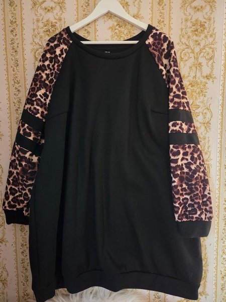 Svart tröja med leopardmönstrade ärmar. Ärmarna har även svarta ränder. Tröjan har en rund halsringning och muddar vid ärmslut.