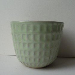 En retro gröntonad mönstrad glasskål. Höjd ca 6,5 cm. Diameter ca 23 cm. Småskavanker som ett kantnagg och repa förekommer, se två sista bilderna. Hund finns i hemmet.