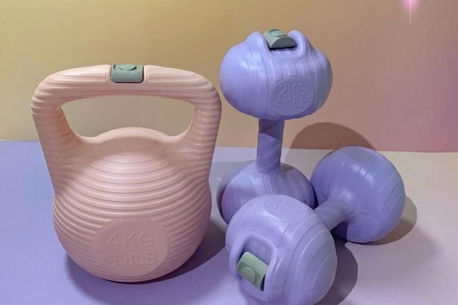 Ett set med träningsutrustning bestående av en rosa kettlebell på 4 kg och två lila hantlar på 2 kg vardera. Perfekt för hemmaträning.