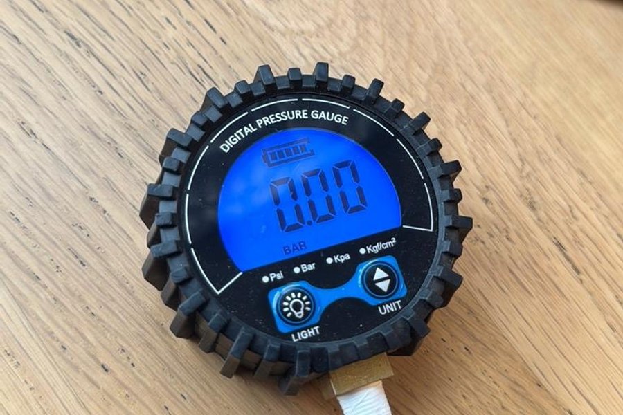 Digital däcktrycksmätare med belyst display. Mäter i Psi, Bar, Kpa och Kgf/cm².