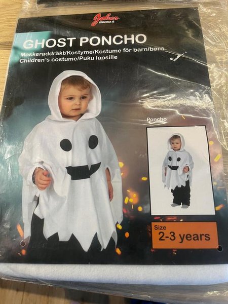 Spökponcho för barn, perfekt för maskerad eller Halloween. Ponchon är vit med svarta ögon och mun som ger ett klassiskt spökeutseende. Den är designad för att vara enkel att ta på och av.