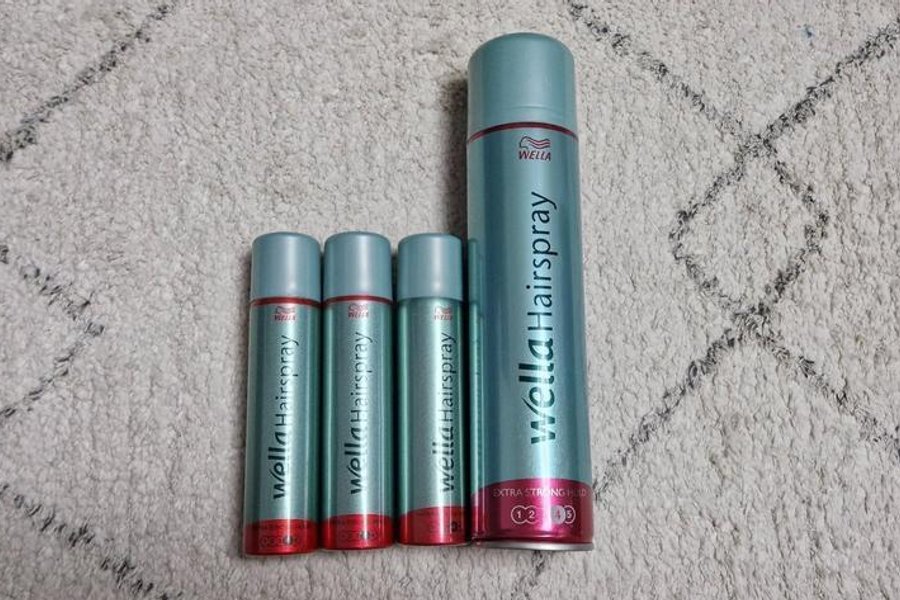 Hårsprej från Wella, extra stark stadga. En stor flaska och tre mindre.