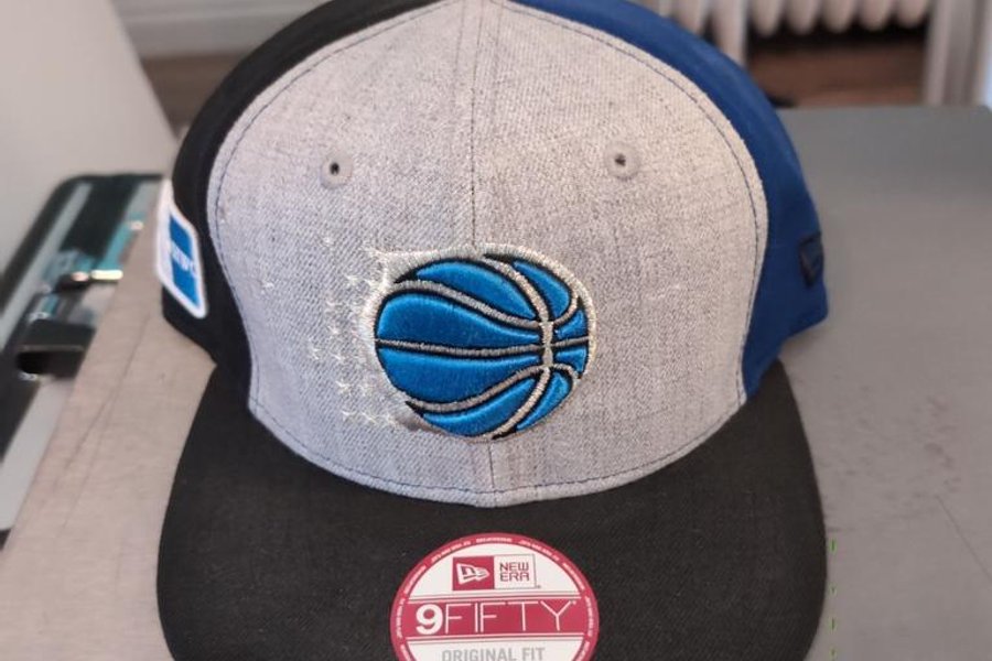 Kepsen har en grå frontpanel med en broderad blå basketboll. Sidopanelerna är blå och den bakre delen är svart. Skärmen är också svart. Det finns en New Era 9FIFTY-etikett på skärmen som indikerar att det är en original fit snapback.