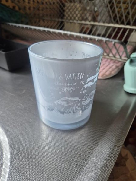 Ljuslykta med texten "SOL, VIND & VATTEN mellan tårna, ta bad, Glädje" och motiv av snäckor.