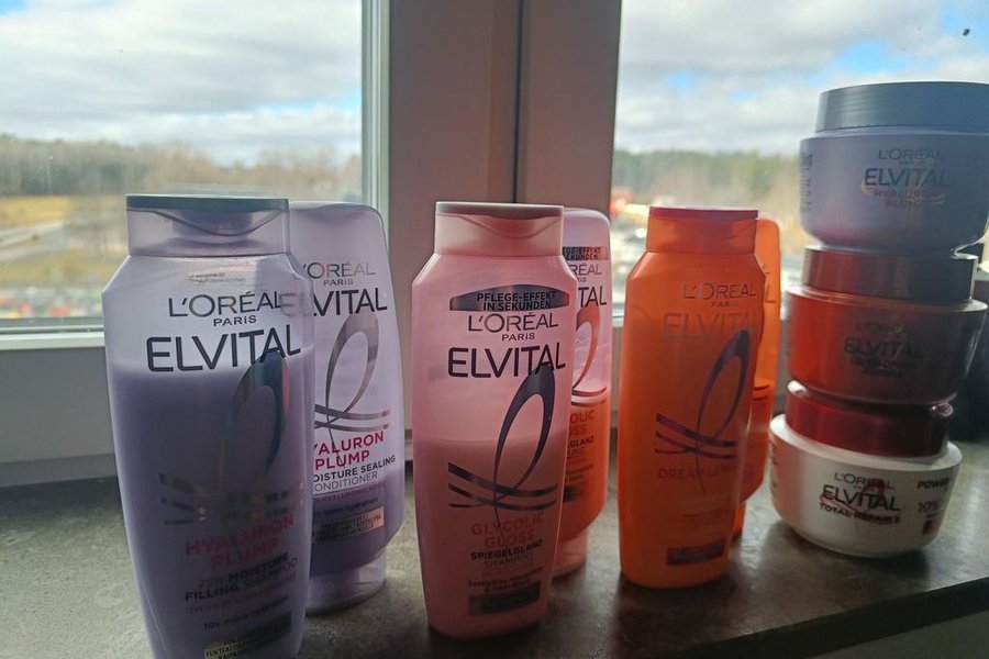 Ett paket med L'Oréal Elvital hårvårdsprodukter. Innehåller schampo, balsam och hårinpackning från serierna Hyaluron Plump, Glycolic Gloss, Dream Length och Total Repair 5.