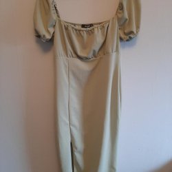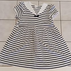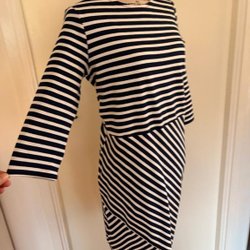 Klänning med kort ärm och rund halsringning. Klänningen har ett grafiskt mönster i svart på en ljus botten.