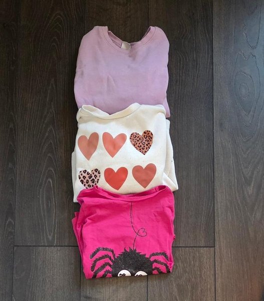 Översta 104, vita 104 men storlek bortklippt, ludd på den, rosa 110/116 men liten i storlek, motsvarar 104. Kan finnas namn eller namnrester.