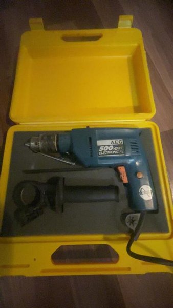 AEG 500W Electronic RL borrmaskin i förvaringslåda. Borrmaskinen är blå med orange detaljer och har en svart strömkabel.