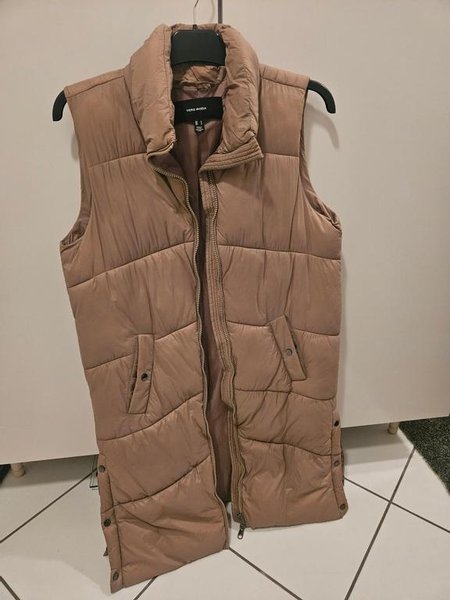 Beige Vero Moda väst med dragkedja framtill och tryckknappar på sidorna. Den har en hög krage och två fickor fram med tryckknappar.