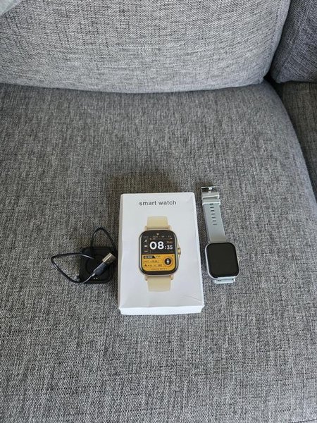 Smartklocka med digital display och grått silikonarmband. Klockan kommer med en laddare. Perfekt för att hålla koll på tid, steg och kalorier.