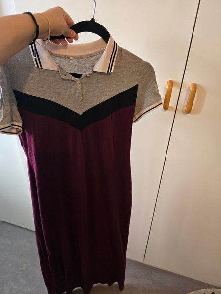 Klänning med en grå överdel, svart v-format fält och en vinröd kjol. Den har en krage med vita och svarta ränder och korta ärmar med liknande ränder.