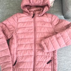 Jacka med dragkedja framtill och krage. Jackan har en justerbar knäppning i midjan och fickor med dragkedja. Ärmsluten är uppvikta.