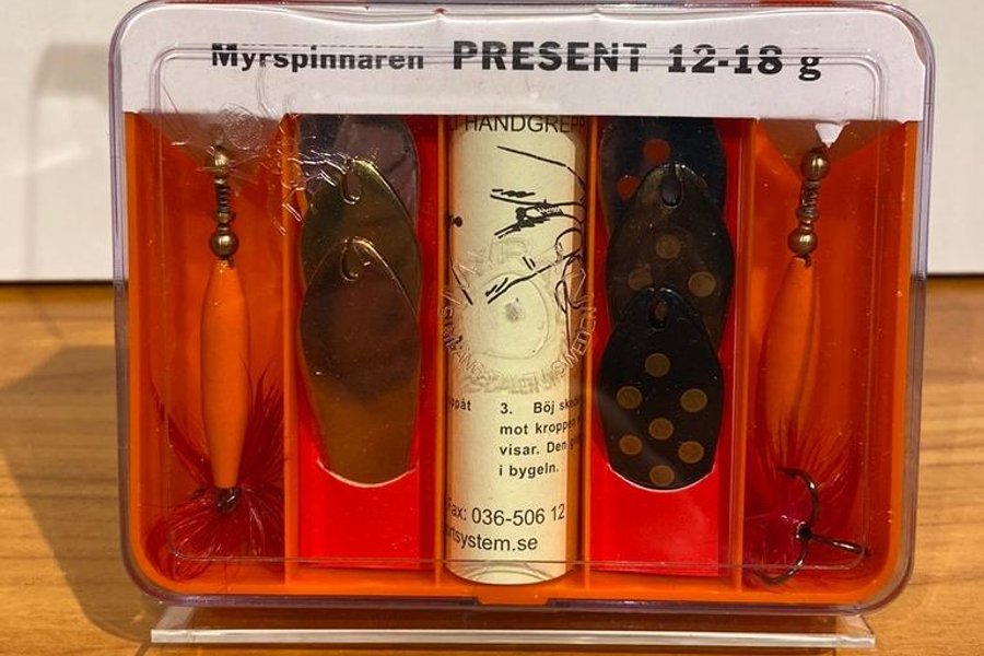 Set med spinnare i olika utföranden. Innehåller flera olika beten och en handgreppsinstruktion. Passar för fiskeentusiaster. Absolut nyskick