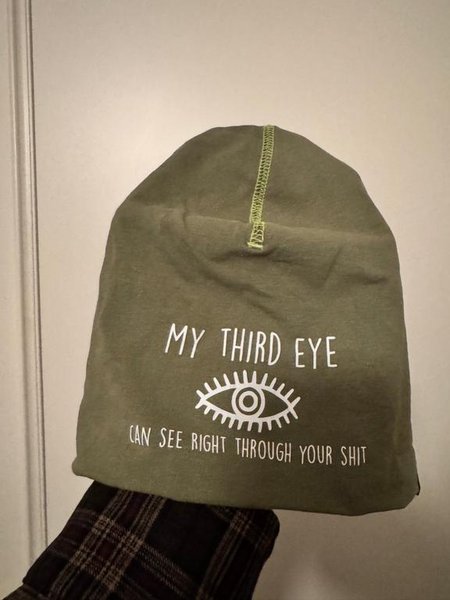 Olivgrön mössa med texten ”MY THIRD EYE” och en bild av ett öga, samt texten ”CAN SEE RIGHT THROUGH YOUR SHIT”.