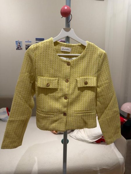 Gul kofta med textur och runda knappar framtill. Kavajen har två fickor med lock upptill och två passpoalfickor nedtill.