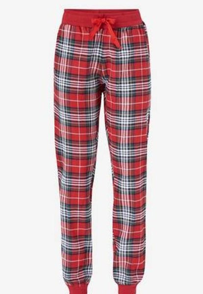 Ett par röda byxor med ett rutigt mönster i rött, vitt, svart och grönt. Byxorna har en resår i midjan med snörning och muddar nedtill. Helt nya från Ellos. Stl 46/48.